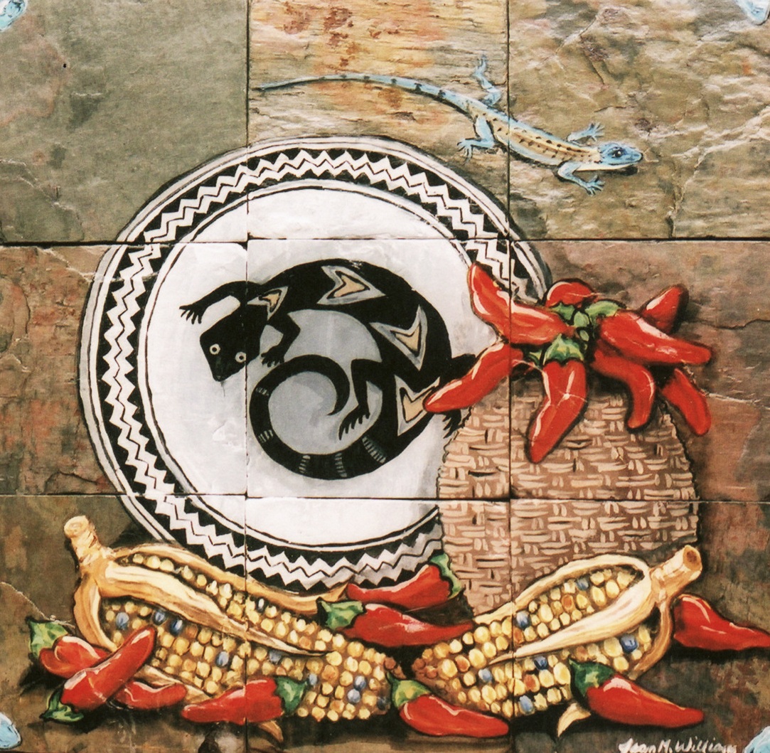 Previous Image Next Image IMG_0003 Mimbres Pottery Design Southwest Slate Tile Mural Red Chiles With Mimbres Lizard Pottery, Corn & Basket