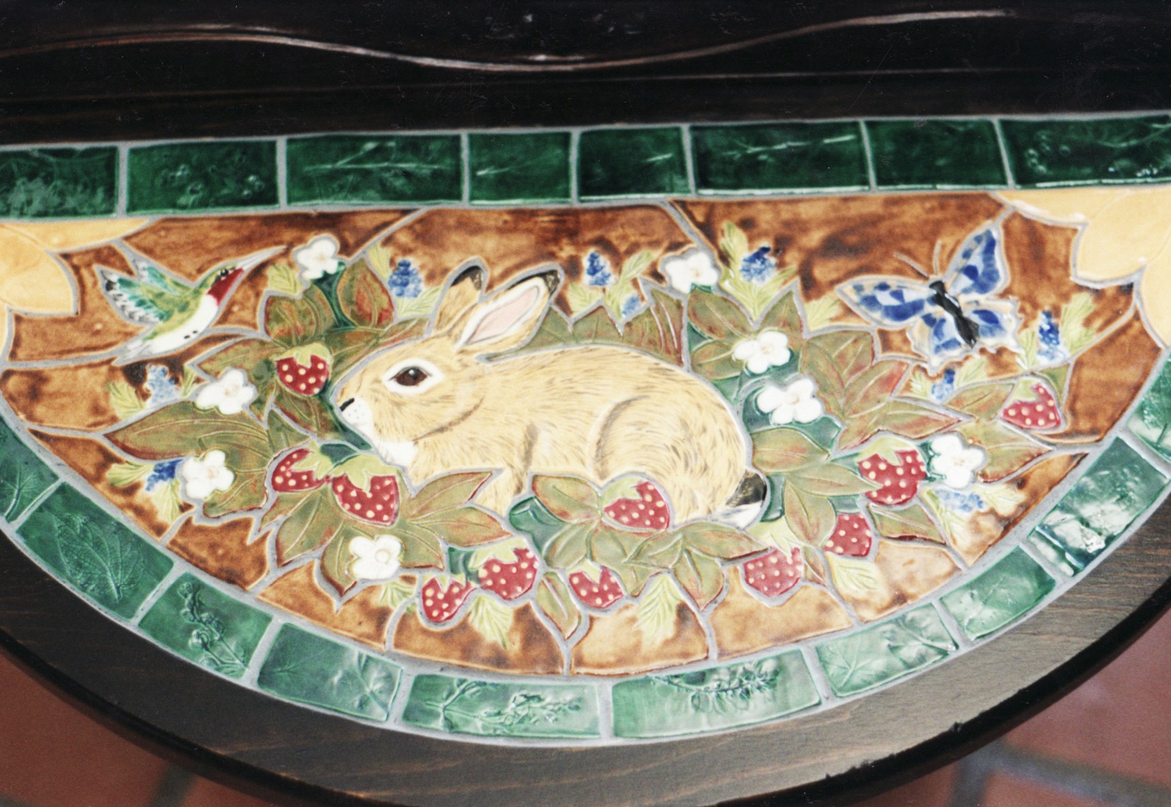 Previous Image Next Image IMG_0014 Handbuilt Tile Rabbit Tabletop Hand Made Ceramic Tile Tabletop of Rabbit with Strawberries